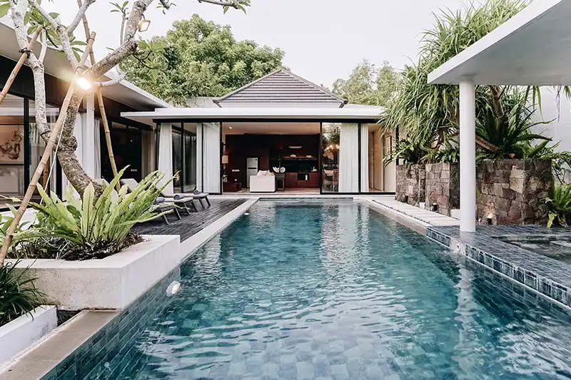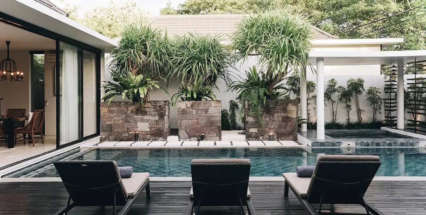 The master bedroom showcases a queen bed with a bathtub under a semi open-roof. The other two bedrooms are decked with a queen and a twin. All three bedrooms have an en-suite, large wardrobe and AC. Full-sized glass doors let in maximum daylight and open out directly to the lush pool garden area. The neutral color scheme promotes a soothing backdrop perfect for a restful night sleep. All shower facilities are equipped with resort-style amenities.